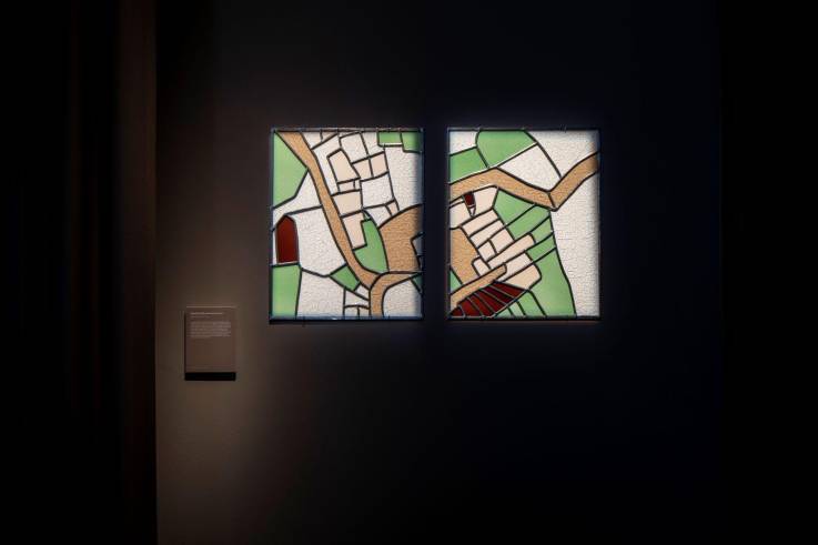Das Diptychon Parcelle 50-620, Pascelupo (2020) von Claudia Passeri, das ebenfalls in der Ausstellung Land in Motion zu sehen ist, zeigt mehrere solcher langgezogenen Felder. In diesem Diptychon reflektiert die Künstlerin unter anderem über Landschaft als geerbtes Gut und kulturelles Konstrukt.