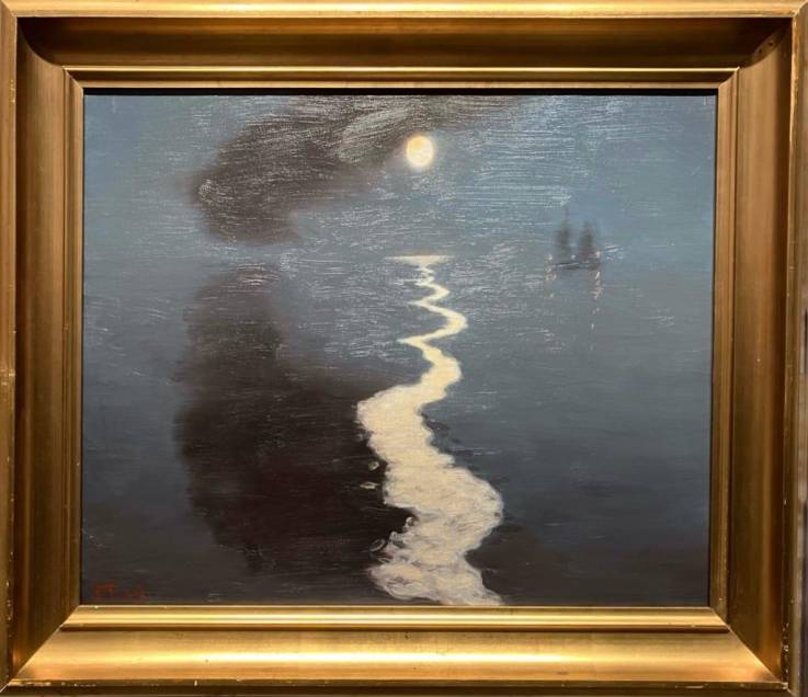 Painted from the stern of a steamer, Moonrise places the viewer aboard a vessel drifting through moonlit waters, where large, jagged shapes trace a shimmering trail beneath the rising moon. Thick, black plumes of smoke billow from the ship’s smokestacks into the night sky. In the upper right corner of the canvas, the faint silhouette of a sailing ship flickers with a few small, dancing lights. It’s unclear where the sea ends and the sky begins, the composition bordering on abstraction.