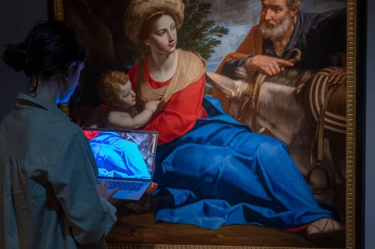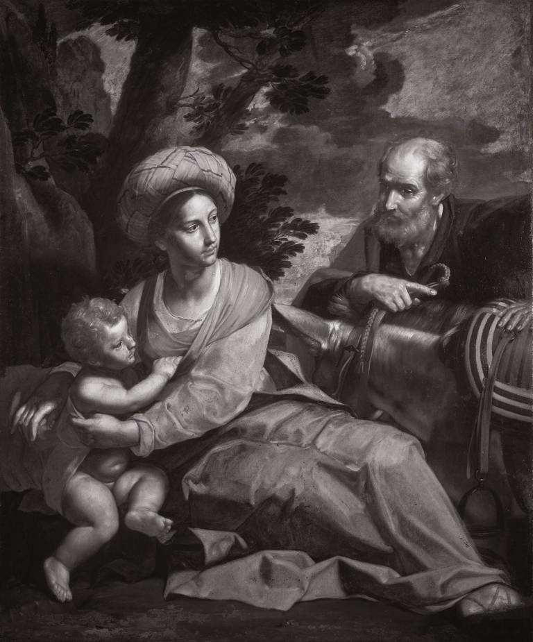 Infrared imaging has revealed a preparatory drawing in black paint beneath the surface of Rest on the Flight into Egypt, showing slight variations from the final composition. Numerous compositional adjustments, or pentimenti, are also visible throughout the painting, indicating that the artist refined his design during the painting process. These changes, made both at the drawing stage and after the first layer of paint, reflect a constant search for balance. Together, they reveal Desubleo’s remarkable precision and the careful planning behind this masterful composition. Desubleo’s Rest on the Flight into Egypt reflects the broader historical transformations of 17th-century painting, particularly the shift in materials and techniques. More specifically, it captures the experience of many itinerant artists who, arriving in Italy with a Northern artistic heritage, embraced local traditions in their work. Moreover, this painting brilliantly demonstrates how technique itself can become a language – one that conveys stylistic influences, such as Bolognese classicism, while also expressing the artist’s own precision and sense of composition.