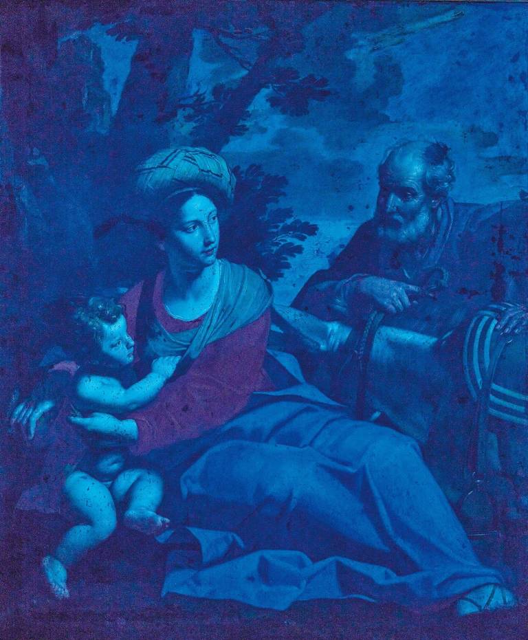 Before painting, artists usually prepared their canvas by applying glue and a layer of primer. This ground layer helped smooth the surface and made sure the paint would adhere properly to the canvas. Colour also played a major role. In Rest on the Flight into Egypt, we can clearly see that Desubleo used a warm brown tone, similar to the one in his self-portrait as Saint Luke (Girometti S., Seccaroni C., 2022). This was a common choice among Italian painters at the time, as noted by contemporary writers from Italy and Spain. It differed from northern European traditions where grey was used more often. Using darker ground layers was a new technique back then, since lighter colours had been more typical. This helped painters achieve visual effects that had rarely been explored prior to the 17th century. Technically speaking, this ground layer is sometimes left visible to serve as a mid-tone, providing a base for constructing shadows and volume through the application of thin dark glazes. In contrast, the luminous flesh tones of Rest on the Flight into Egypt are rendered with thicker brushstrokes and more opaque layers. The result is a measured play of contrasts, defined as a moderate chiaroscuro. This effect also intensifies the light effects – particularly evident in the figures of the Virgin and the Child – contributing to the overall radiance of the composition. It reflects a key feature of the Bolognese classicism that the artist adhered to at the time. Moreover, the use of a darker ground and pronounced contrasts enhances the opacity of pigments, lending greater brightness to the colors. The vivid blues and deep reds – likely influenced by his fellow artist Guido Reni – constitute a restrained yet striking palette, characteristic of the Bolognese school. The artist’s controlled but rich chromatic range is also evident in the use of two distinct blue pigments, clearly visible through composite imaging.