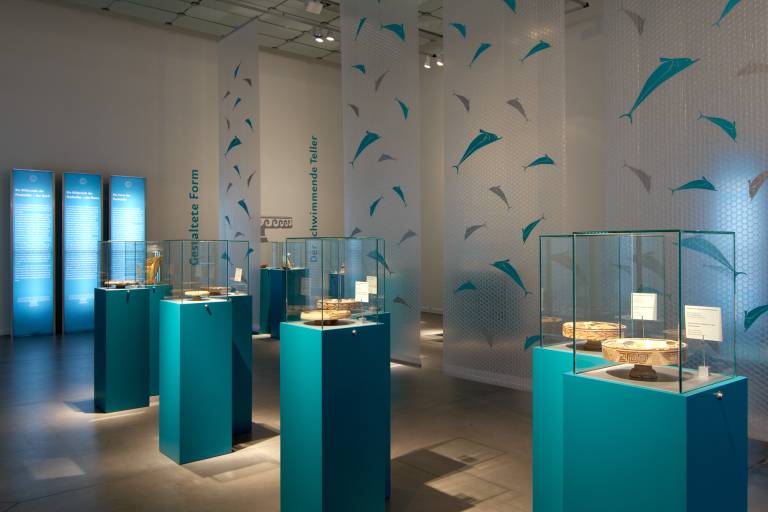 Les plats à poissons ont été réalisés au IVe siècle avant J.-C. en Attique, en Italie du Sud et en Sicile. Près de 2500 ans plus tard, ces objets d'art n'ont rien perdu de leur attrait, tandis que leur destination et leur utilisation restent sujettes à de nombreuses interprétations. Une faune marine très abondante - brillamment reproduite sur un fond d'un rouge brun éclatant - s'active devant un arrière-plan uniformément noir. Ce jeu de couleurs contrastées et plein de tensions ne manque pas d'impressionner l'observateur contemporain qui y découvre sans cesse de nouveaux détails.
