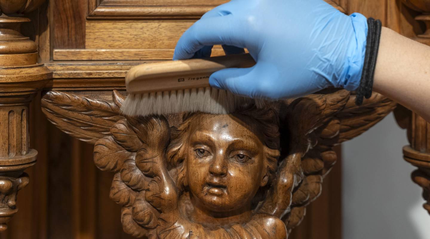 Le dépoussiérage, dans notre musée, ne se résume pas à un simple toilettage. Chaque oeuvre, qu’il s’agisse de sculptures, de tableaux ou d’objets d‘artisanat, nécessite une attention particulière. Pinceaux doux, plumeaux, microfibres et aspirateurs à faible puissance sont nos alliés pour éliminer la poussière sans risquer de détériorer les matériaux fragiles. L’équipe qui intervient joue un rôle clé dans ce processus. Chaque membre connaît les spécificités des oeuvres qu’il supervise, et c’est en connaissant chaque recoin, chaque texture, que les gestes s’adaptent. Les chefs-d‘oeuvre de notre collection sont ainsi inspectés sous toutes les coutures : des côtés visibles aux revers, chaque détail compte. Si la poussière est éradiquée, c’est aussi l’occasion de vérifier l’état sanitaire de nos protégés. Les restaurateurs et restauratrices en profitent pour effectuer une inspection visuelle, déceler des traces d’infestations ou repérer de petits signes de détérioration qui auraient pu passer inaperçus autrement.