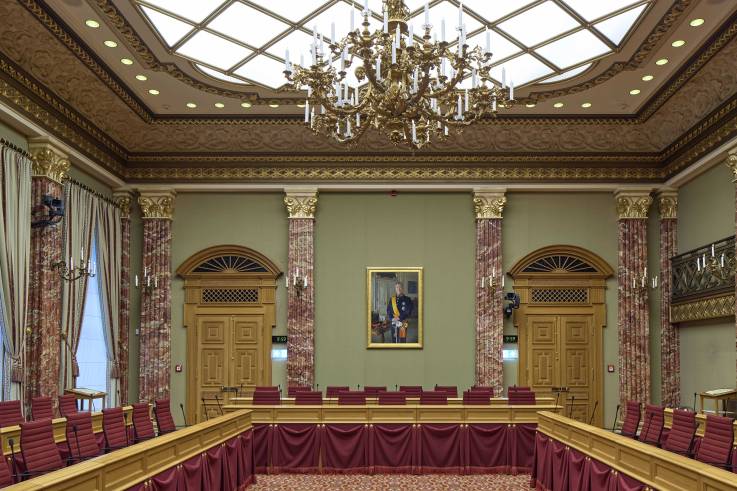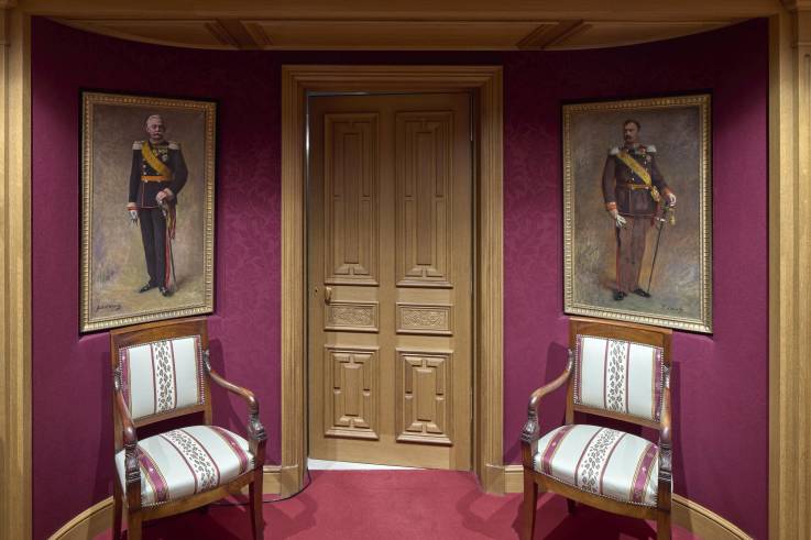 La large baie vitrée du Nationalmusée donnant sur le Fëschmaart servira d’écrin aux portraits de Leurs Altesses Royales réalisés par Louise Pragnell, Andrew Gow et Roland Schauls ainsi qu’au buste sculpté de Serge Ecker jusqu’au 1er février. L’occasion était trop belle pour ne pas détailler quelques portraits des souverains luxembourgeois présents dans les collections nationales et toujours exposés… à la Chambre des Députés !