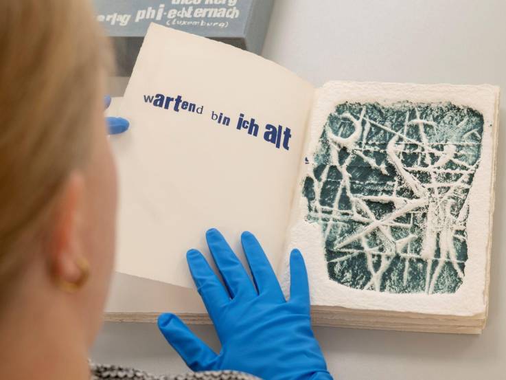 Les archives contiennent également de nombreux dossiers documentant la collaboration de Théo Kerg avec d’autres artistes, parmi lesquels le poète grec Odysseas Elytis (1911-1996), lauréat du prix Nobel de littérature en 1979. Ce dossier retrace la création de leur oeuvre conjointe, des premières ébauches jusqu’au produit final, à savoir la publication de l’ouvrage 4 Gedichte in prosa neugriechisch und deutsch aus Tagebuch eines nie gesehenen April. On y trouve des notes, des lettres échangées entre leurs deux artistes, des ébauches de texte ainsi que deux exemplaires de l’ouvrage signés par les auteurs. Fait quelque peu hors du commun, le dossier offre également l’ensemble de la collection des plaques d’impression, véritables archives en trois dimensions, créées par Kerg pour les estampes illustrant l’ouvrage.