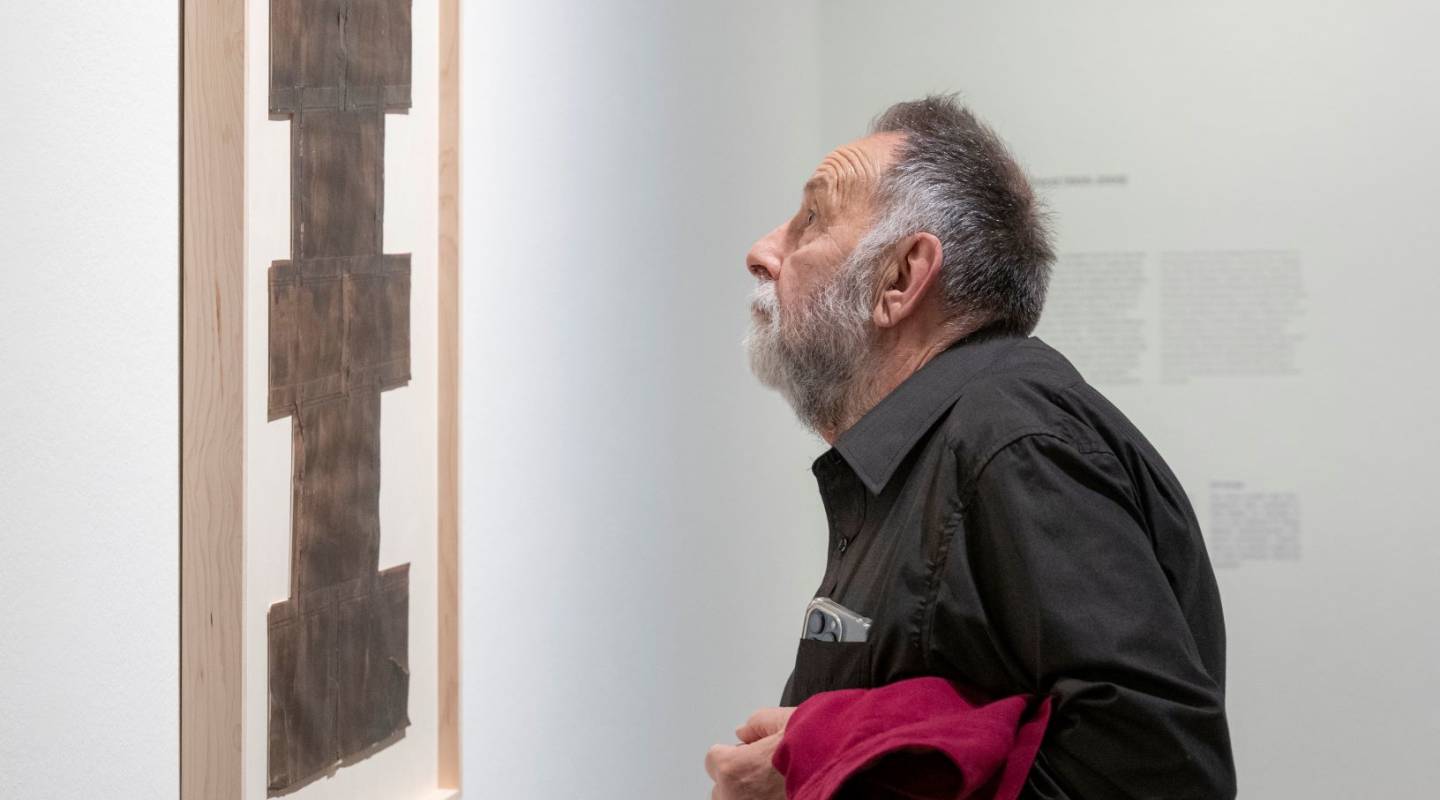 Noël Dolla en visite au musée, admirant une œuvre de Daniel Dezeuze (*1942) en bitume de judée et scotch sur papier.